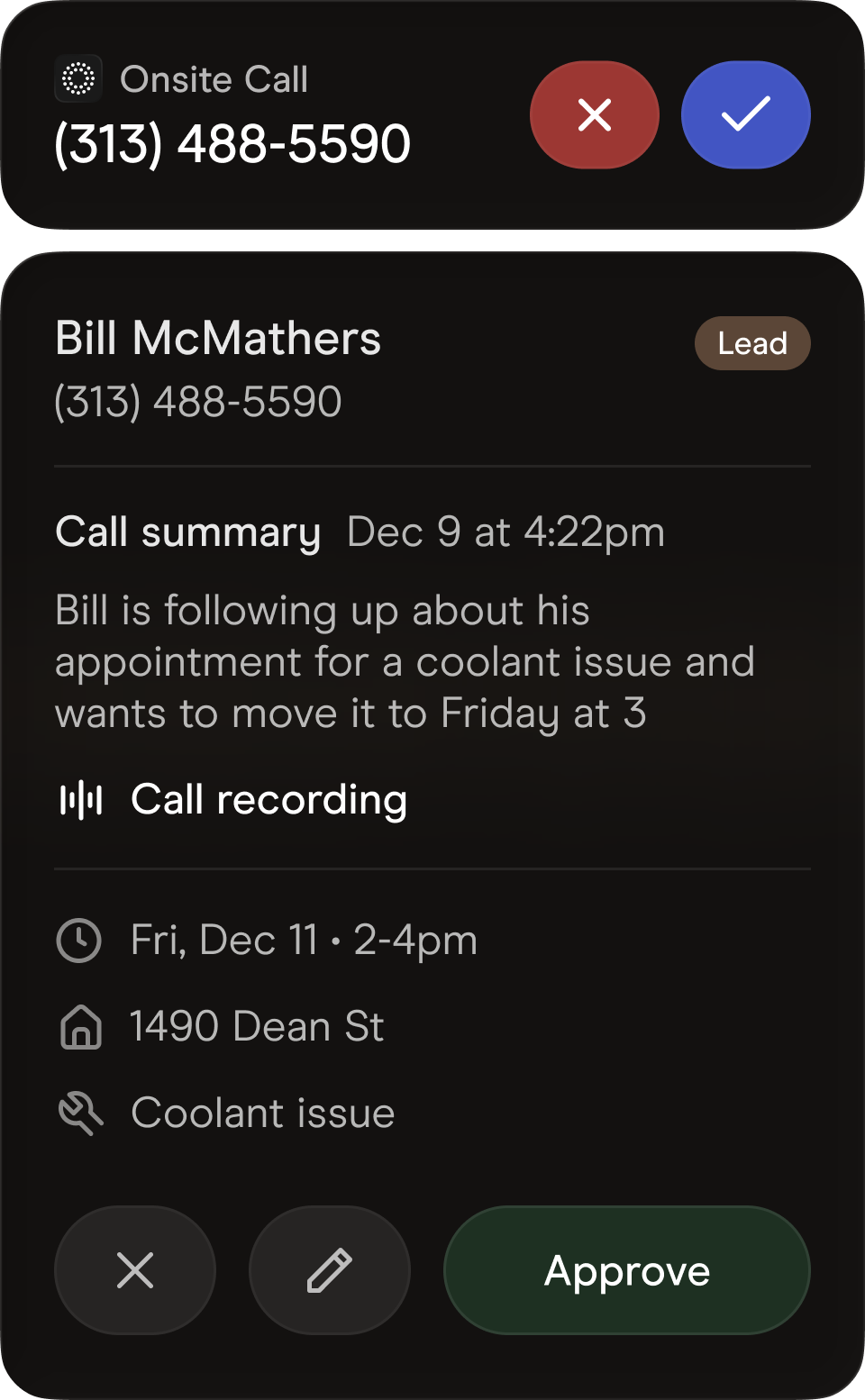 Onsite suggests the next action after every customer interaction. We’ll book the job, follow-up, or create an estimate based on the data we analyze during your customer calls. You approve, decline, or edit in seconds. No more manually entering data or forgetting to follow up.