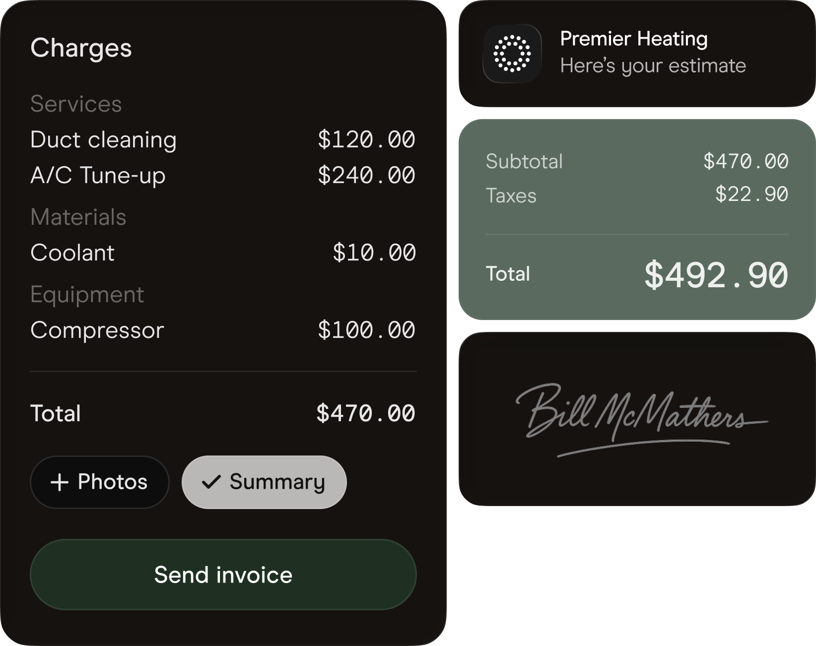Generate professional estimates and invoices on the fly. Send them to customers automatically, track their approval status and get paid all from your phone. Go from sent to signed in seconds.